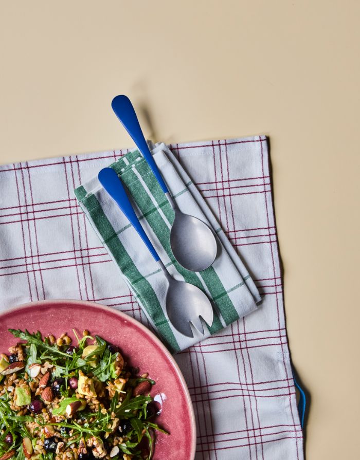 Das Salatbesteck Serv von House Doctor bringt frischen Schwung auf deinen Tisch. Das zweiteilige Set überzeugt durch hochwertigen Edelstahl in Antiksilberoptik und kräftige blaue Griffe, die jedem Salat einen stilvollen Auftritt verleihen. Rustikale Eleganz trifft hier auf moderne Farbdetails – perfekt für entspannten Brunch, Gartenfeste oder festliche Dinner. Kombiniert mit Keramikschalen oder dekorativem Geschirr entsteht ein harmonisches, ansprechendes Tischarrangement.