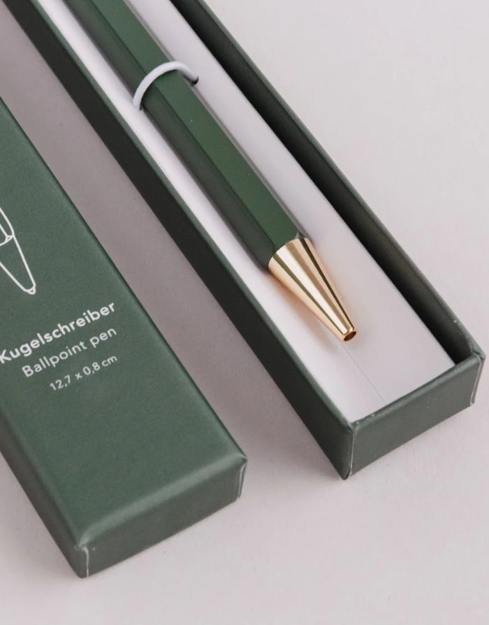 Der Kugelschreiber Rosmarin von Eulenschnitt bringt frischen Wind auf deinen Schreibtisch. Mit seinem zarten Grünton und den eleganten goldenen Details verbindet er zeitloses Design mit moderner Leichtigkeit. Die angenehme Haptik sorgt für ein komfortables Schreibgefühl – ideal für Alltag, Büro oder kreative Gedankenblitze.