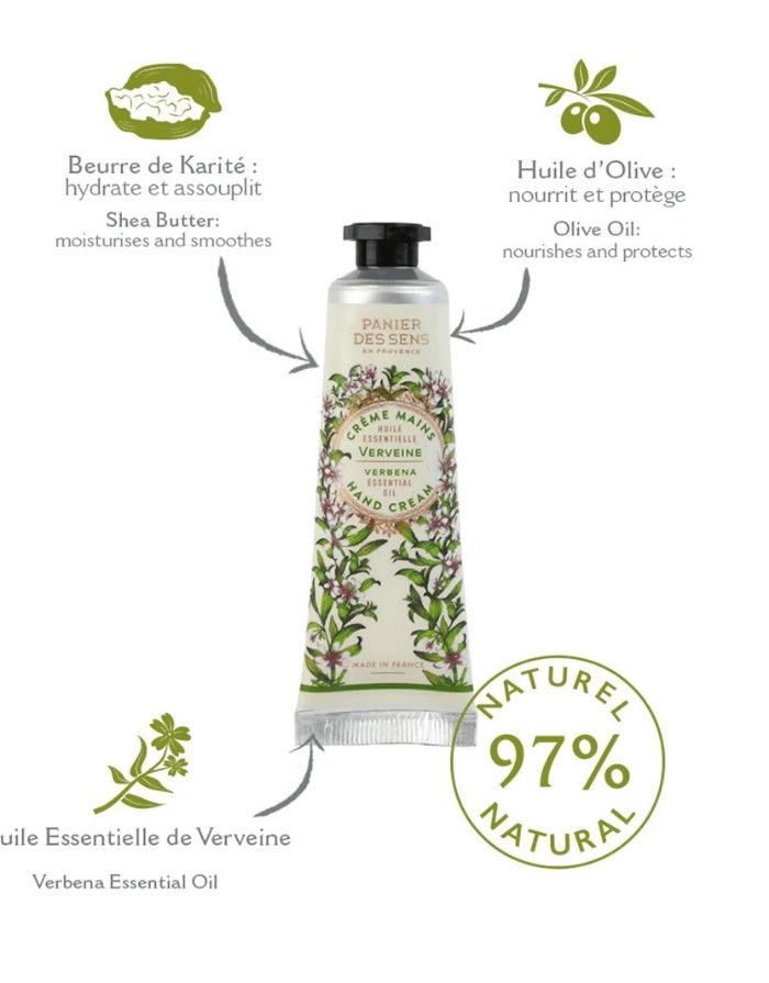 Handcreme Belebende Verbene 30ml von Panier Des Sens: Eine Handcreme im Mini-Format, die leicht in Ihre Handtasche passt oder auf Reisen mitgenommen werden kann, um jederzeit hydratisierte und schöne Hände zu haben. Die Formel mit Sheabutter, Olivenöl und ätherischem Verbenaöl sorgt für Feuchtigkeit, Pflege und einen zarten, erfrischenden Duft. Das ätherische Verbenaöl wirkt belebend und tonisierend, während die Sheabutter die Haut geschmeidig macht und nährt. Perfekt für unterwegs oder zwischendurch, um den Händen eine kleine Verwöhnpause zu gönnen.