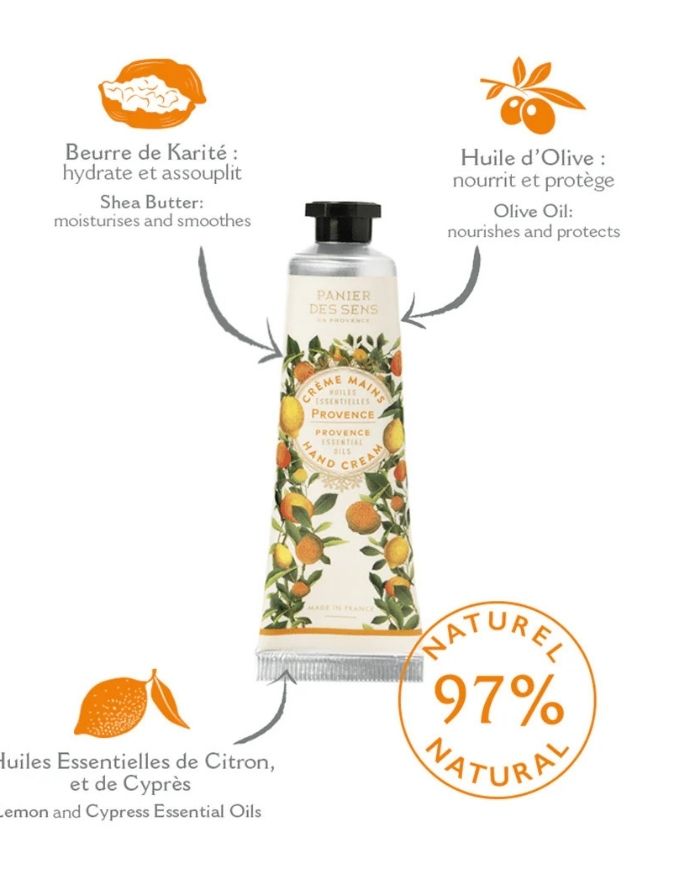 Handcreme Provence 30ml von Panier Des Sens: Die Handcreme Provence im Mini-Format passt ideal in die Handtasche oder auf Reisen. Sie pflegt die Hände mit Sheabutter, Olivenöl und ätherischen Ölen aus Zitrone und Zypresse, spendet intensive Feuchtigkeit und hinterlässt die Haut weich und geschmeidig. Der spritzige, sommerliche Duft der Provence belebt die Sinne und macht die tägliche Handpflege zu einem kleinen Genuss.