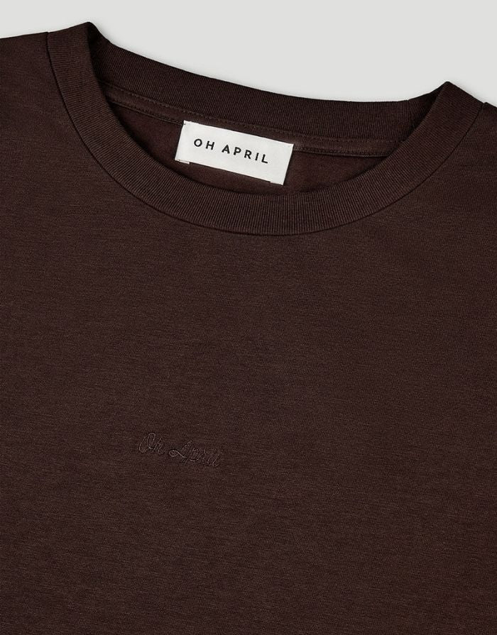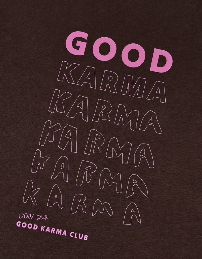 Details: OH APRIL Stickerei auf der Brust, Good Karma Print auf dem Rücken