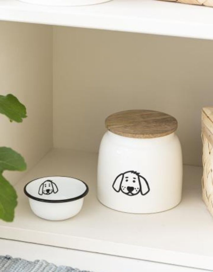 Die Hundefutterdose von Ib Laursen ist die perfekte Kombination aus Funktionalität und charmantem Landhausstil. In klassischem Weiß gehalten und mit einem liebevollen Hundemotiv verziert, fügt sie sich harmonisch in jede Küche ein. Der natürliche Holzdeckel sorgt nicht nur für einen warmen, nordischen Look, sondern verschließt die Dose auch zuverlässig – ideal, um Trockenfutter aromafrisch und geschützt aufzubewahren.