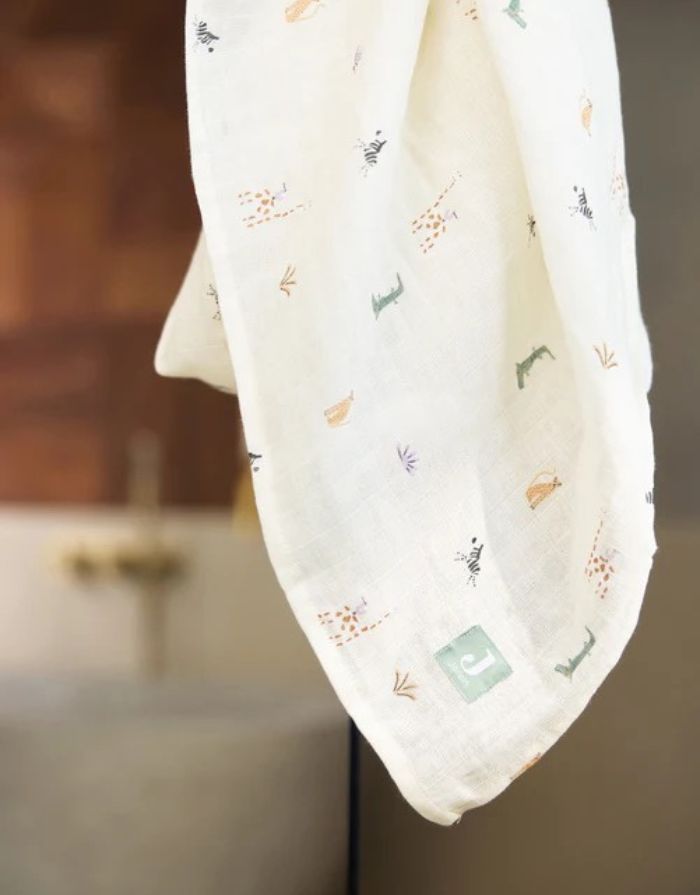 Mit unseren weichen Jungle Jambo Mulltüchern von Jollein bist du für jedes kleine Abenteuer mit deinem Baby bestens gerüstet. Die Tücher bestehen aus angenehm atmungsaktiver Baumwolle und sind wahre Alleskönner – perfekt als Spucktuch, Handtuch, Unterlage beim Wickeln oder leichte Decke unterwegs. Der verspielte Jungle Jambo-Print mit kleinen Geparden in sanften Naturfarben, zartem Lila und Grün bringt einen Hauch von Wildnis ins Kinderzimmer.