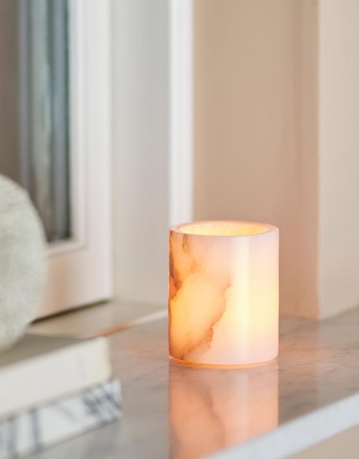 Der Teelichthalter Annebell in Weiß von Bloomingville ist ein elegantes Wohnaccessoire mit natürlicher Ausstrahlung. Gefertigt aus poliertem Alabaster, besticht er durch seine sanften Farbnuancen und feinen Strukturen, die jedes Stück zu einem Unikat machen. Das warme Kerzenlicht schimmert weich durch das Naturmaterial und sorgt für eine ruhige, stimmungsvolle Atmosphäre – perfekt für Wohnbereich, Schlafzimmer oder Badezimmer.