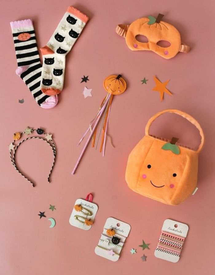 Unser kleines Kürbis-Körbchen von Rockahula bringt herbstlichen Zauber ins Kinderzimmer und ist der perfekte Begleiter zu Halloween! Gefertigt aus weichem, leuchtend orangefarbenem Samt, mit gesticktem Gesicht, rosigen Wangen sowie kleinem Stiel und Blatt. Innen überrascht das Körbchen mit dem charakteristischen Rockahula-Streifenfutter – ideal für „Trick or Treating“ und alle süßen Schätze, die gesammelt werden wollen.