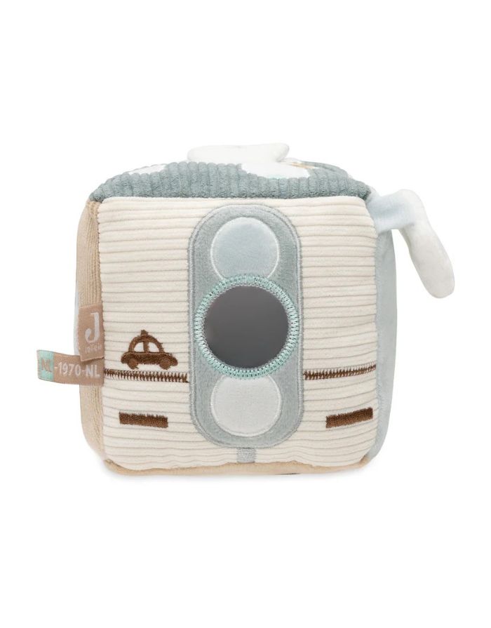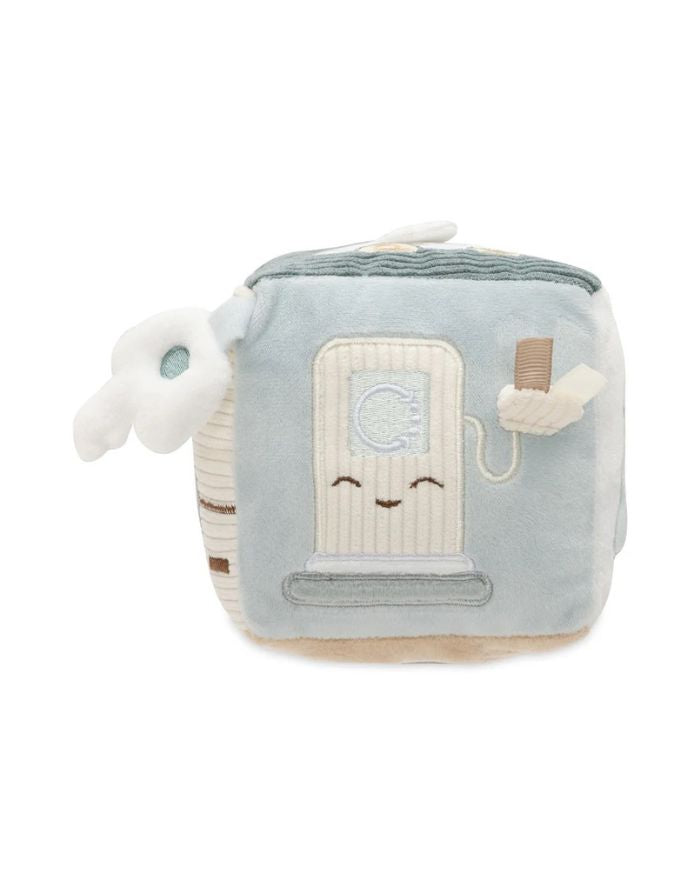 Jollein Aktivitäten-Würfel „On The Go“ – weicher Baby-Spielwürfel mit Schlüssel, Spiegel, Tankstellenmotiv und Ampel, Sea Green & Biscuit, 10x10x10 cm, handwaschbar.