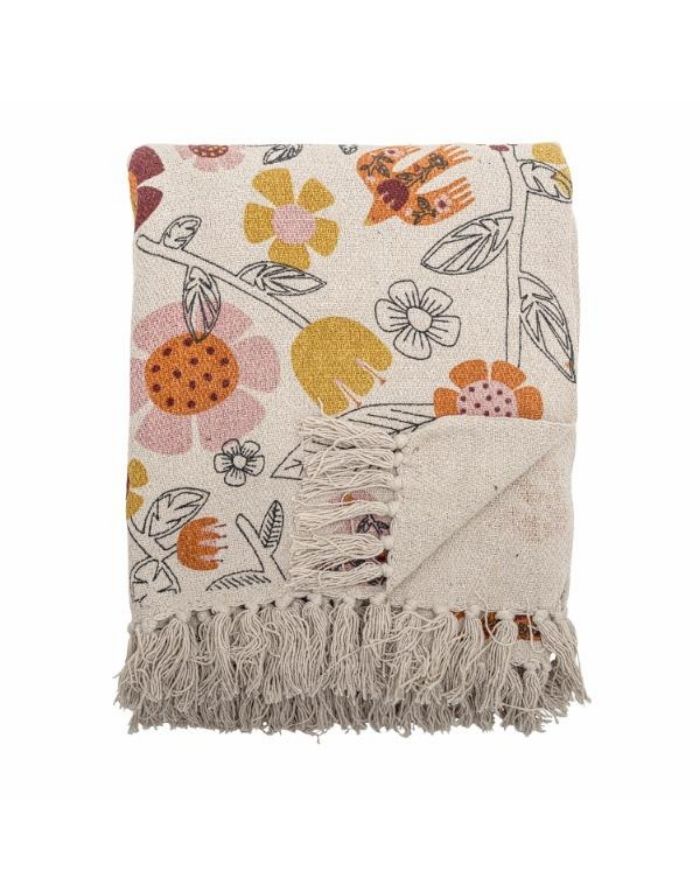 Bloomingville Vivielle Decke in Bunt mit floralem Print auf beigem Grund, strukturierter Oberfläche und farblich abgestimmten Fransen aus recycelter Baumwolle