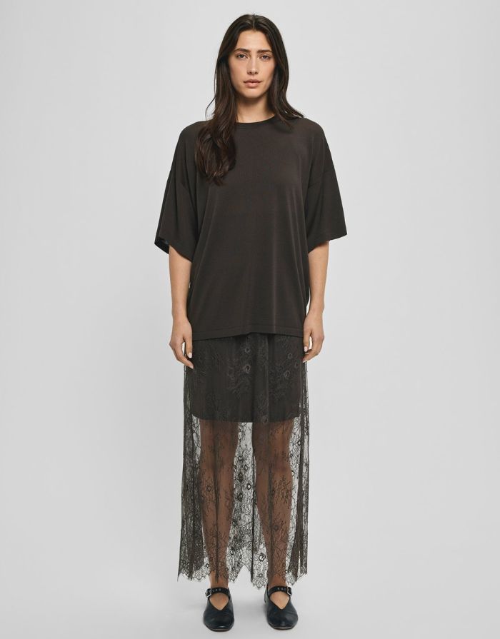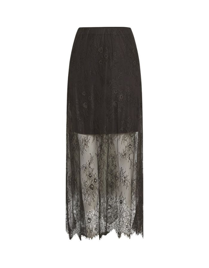 Mit dem Rock Dusty HW in Delicioso von MSCH Copenhagen entsteht eine leichte und elegante Silhouette mit feiner Struktur. Der Maxirock aus transparenter Spitzenqualität verbindet eine luftige Außenlage mit einem kürzeren, blickdichten Unterrock und schafft so ein ausgewogenes Spiel aus Transparenz und Deckkraft. Die gerade Form wirkt ruhig und modern, während die zarte Spitze dem Design eine feminine Note verleiht.