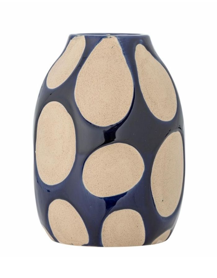 Mit unserer Bashir Vase von Bloomingville zieht grafische Eleganz in dein Zuhause ein. Die Vase aus Steingut begeistert mit ihrer weich abgerundeten Silhouette, einer glänzenden, wachsbeschichteten blauen Glasur und markanten beigefarbenen Ovalen, die ihr einen modernen, kunstvollen Ausdruck verleihen. Ein stilvolles Statement-Piece für Regale, Sideboards oder den Esstisch.