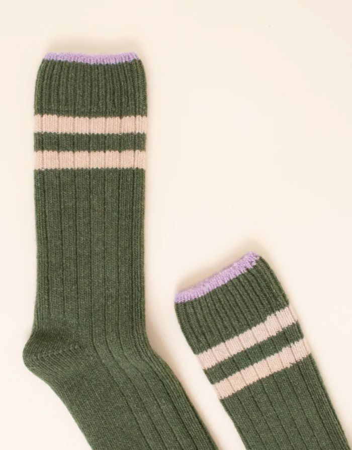 Stylisch, kuschelig und nachhaltig: Diese Stricksocken aus recycelter Wolle sind die moderne Antwort auf Omas Geheimtipp gegen kalte Füße. In kräftigem Grün mit Ecru Streifen setzen sie frische Akzente und passen perfekt zu Sneakern oder Hausschuhen. Ob für den Alltag oder gemütliche Wintertage – mit diesen Socken bleibst du garantiert warm.