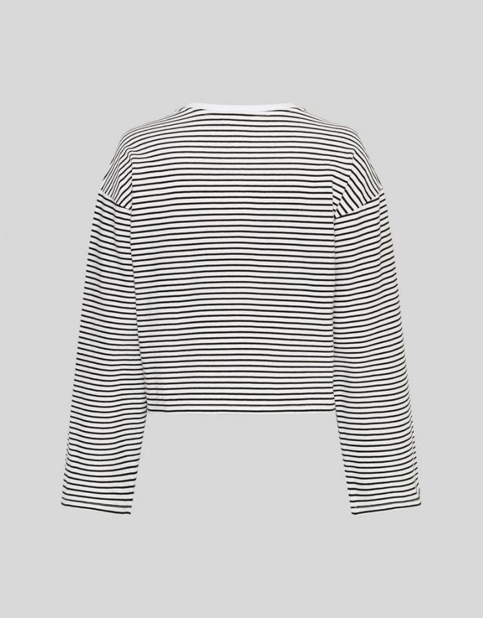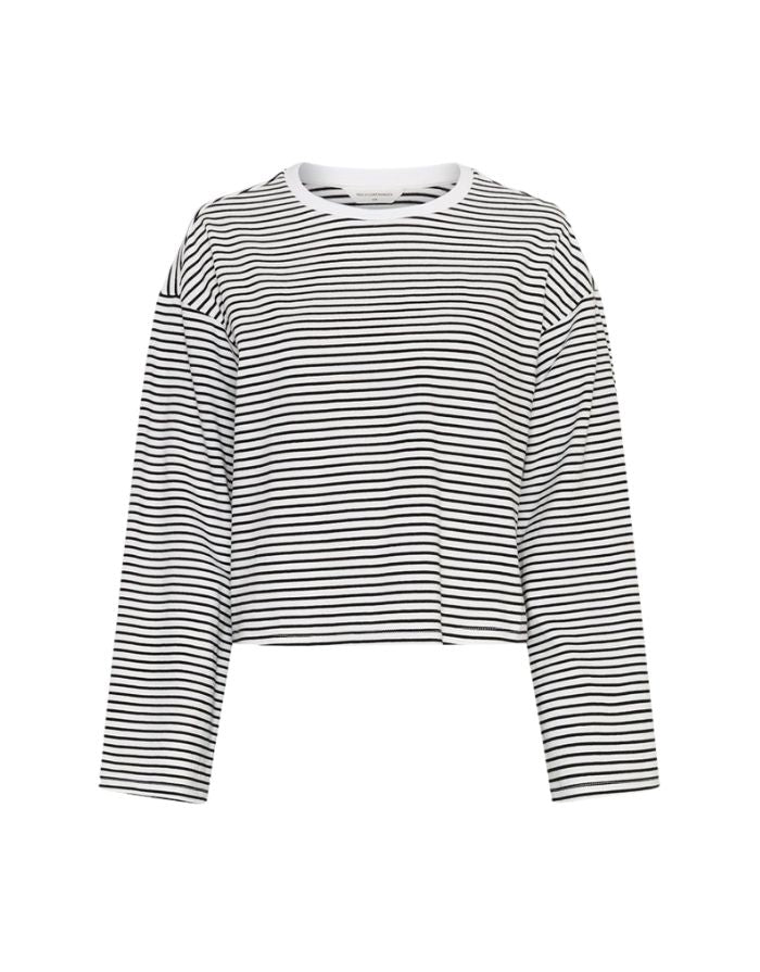 Der Pullover Krestiane Stripe in Egret/Black von MSCH Copenhagen ist ein zeitloses Essential mit modernem Twist. Das klassische Streifenmuster in Weiß und Schwarz trifft auf eine entspannte Silhouette mit überschnittenen Schultern und langen Ärmeln. Der lockere Schnitt sorgt für ein angenehmes Tragegefühl und macht den Pullover zum perfekten Begleiter für den Alltag – unkompliziert, bequem und stilvoll zugleich. Ob zu Jeans, Stoffhosen oder Röcken kombiniert, dieses Longsleeve lässt sich vielseitig stylen und passt in jede moderne Garderobe.