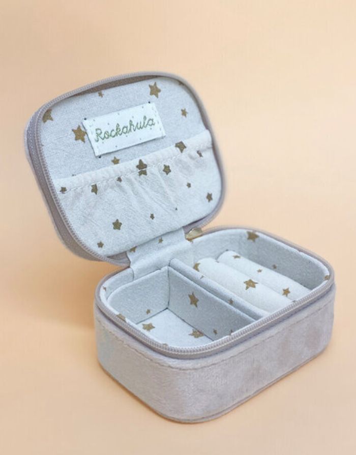 Unsere wunderschöne Samt-Schmuckschatulle Disco Rainbow ist der entzückendste Ort, um all den süßen Rockahula-Schmuck und die Lieblingsschätze deines Kindes sicher aufzubewahren! Diese Schmuckschatulle mit einem wunderschönen gestickten Regenbogen hat einen Reißverschluss und öffnet sich, um ein Fach, eine Einstecktasche und einen speziellen Platz zum Einstecken von Ohrringen und Ringen freizulegen. Vollständig gefüttert mit dem schönsten Stoff mit Sternenstreuung.
