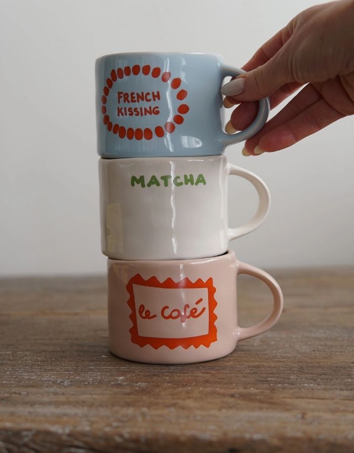 Der Henkelbecher Le café von SISI ist ein zarter, fröhlicher Farbtupfer für deinen Alltag. Der Keramikbecher in hellem Rosa mit glänzendem Finish trägt den handschriftlichen Schriftzug Le café in sonnigem Orange – ein kleines Mood-Lift für jeden Schluck und ein wunderschöner Akzent für dein Frühstücks- oder Brunch-Setting. Mit seinem modernen, zugleich verspielten Look wird er schnell zum neuen Lieblingsbecher.