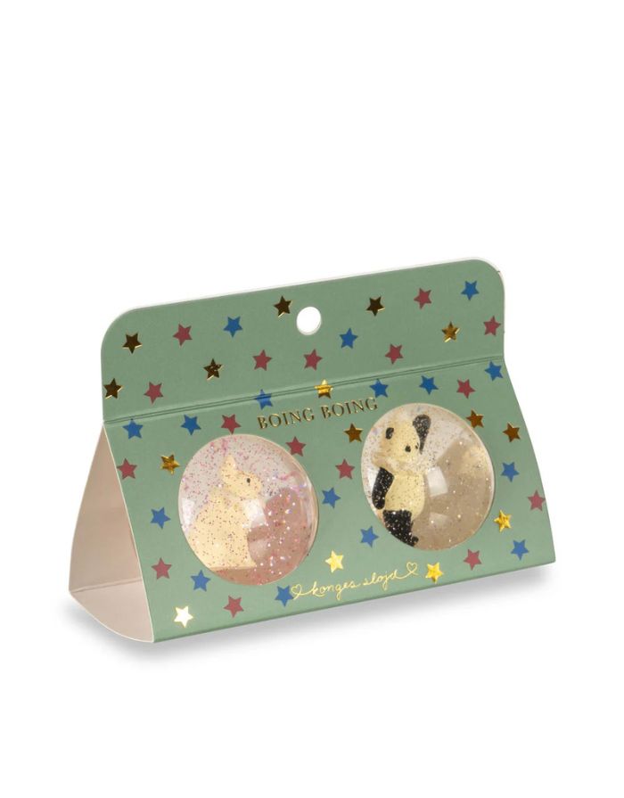 Zwei transparente Flummi-Bälle von Konges Sløjd mit 3D-Figuren und Glitzer im Inneren.