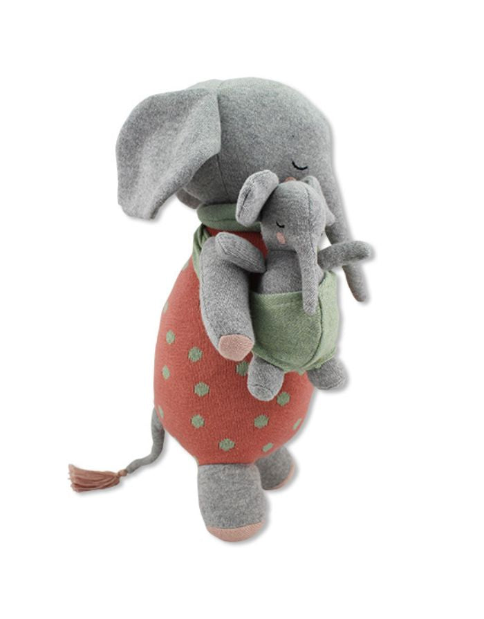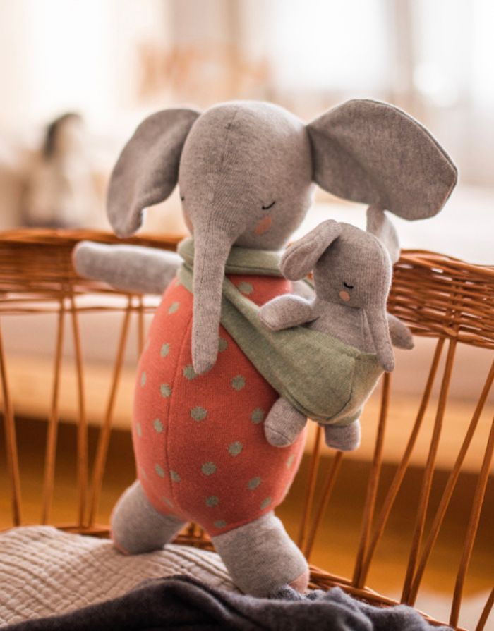 Mit unserer Elefantenmutter „Marlene“ samt Baby zieht ein besonders liebevoll gestaltetes Kuscheltier ins Kinderzimmer ein. Gefertigt aus feinem Bio-Baumwollstrick und gefüllt mit recyceltem Polyester, vereint es Nachhaltigkeit, Qualität und einen unverwechselbaren Charakter. Das Baby-Elefantenkind kann aus dem Tuch genommen und auch separat bespielt werden – perfekt zum Kuscheln, Spielen und Liebhaben.