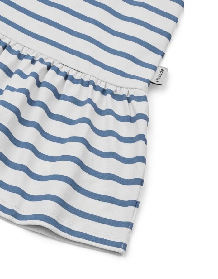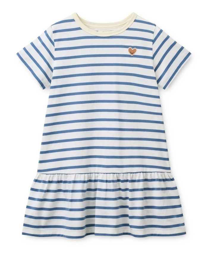 Mit unserem gestreiften MADDEN Kleid von Liewood wird der Sommer herrlich leicht. Das weiche T-Shirt-Kleid aus atmungsaktivem Bio-Baumwolljersey ist ideal für warme Tage, unbeschwerte Drehungen und entspannte Alltagsmomente. Der breite Rüschensaum verleiht dem Design eine verspielte Note und sorgt für maximale Bewegungsfreiheit.