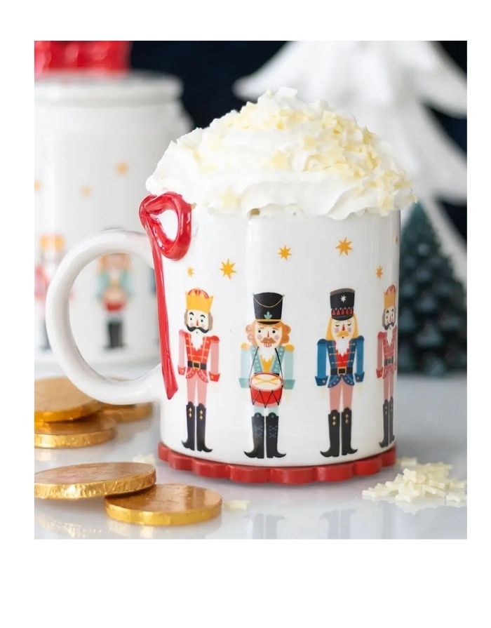 Der Nussknacker Weihnachtsbecher mit Schleife von Something Different bringt klassischen Festtagscharme direkt in deine Kaffeepause. Verziert mit einem liebevollen Nussknacker-Motiv und einer festlichen roten Schleife am Henkel, wird jeder Schluck zum kleinen Weihnachtsmoment. Perfekt für heiße Schokolade, Tee oder Kaffee – und ideal für gemütliche Winterabende, Adventssonntage oder als hübsches Geschenk in der Vorweihnachtszeit.