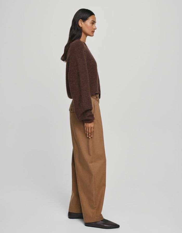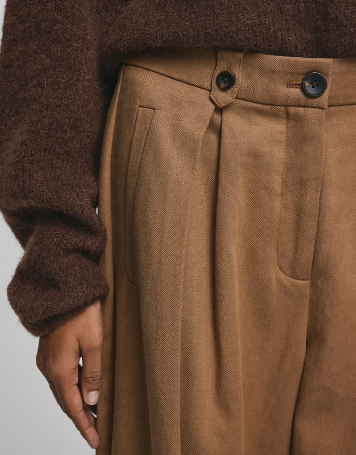 Die Hose Gweneth in der Farbe Toasted Coconut von MSCH Copenhagen ist ein moderner Klassiker für jeden Tag. Mit ihrem eleganten Camel-Braunton, den Bundfalten und dem hochwertigen Materialmix verbindet sie zeitlosen Chic mit bequemem Tragekomfort. Die weich fließende Out-Lyocell- und Baumwollmischung sorgt für ein angenehmes Hautgefühl und eine schöne, natürliche Struktur. Hinten runden zwei Taschen mit Knopf das Design stilvoll ab und verleihen der Hose einen cleanen, modernen Look. Perfekt für Büro, Freizeit oder als vielseitiger Allrounder in deiner Capsule Wardrobe.